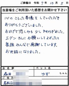 令和7年10月に愛ペットにてペット葬儀・火葬を執り行った【ご家族様の声】